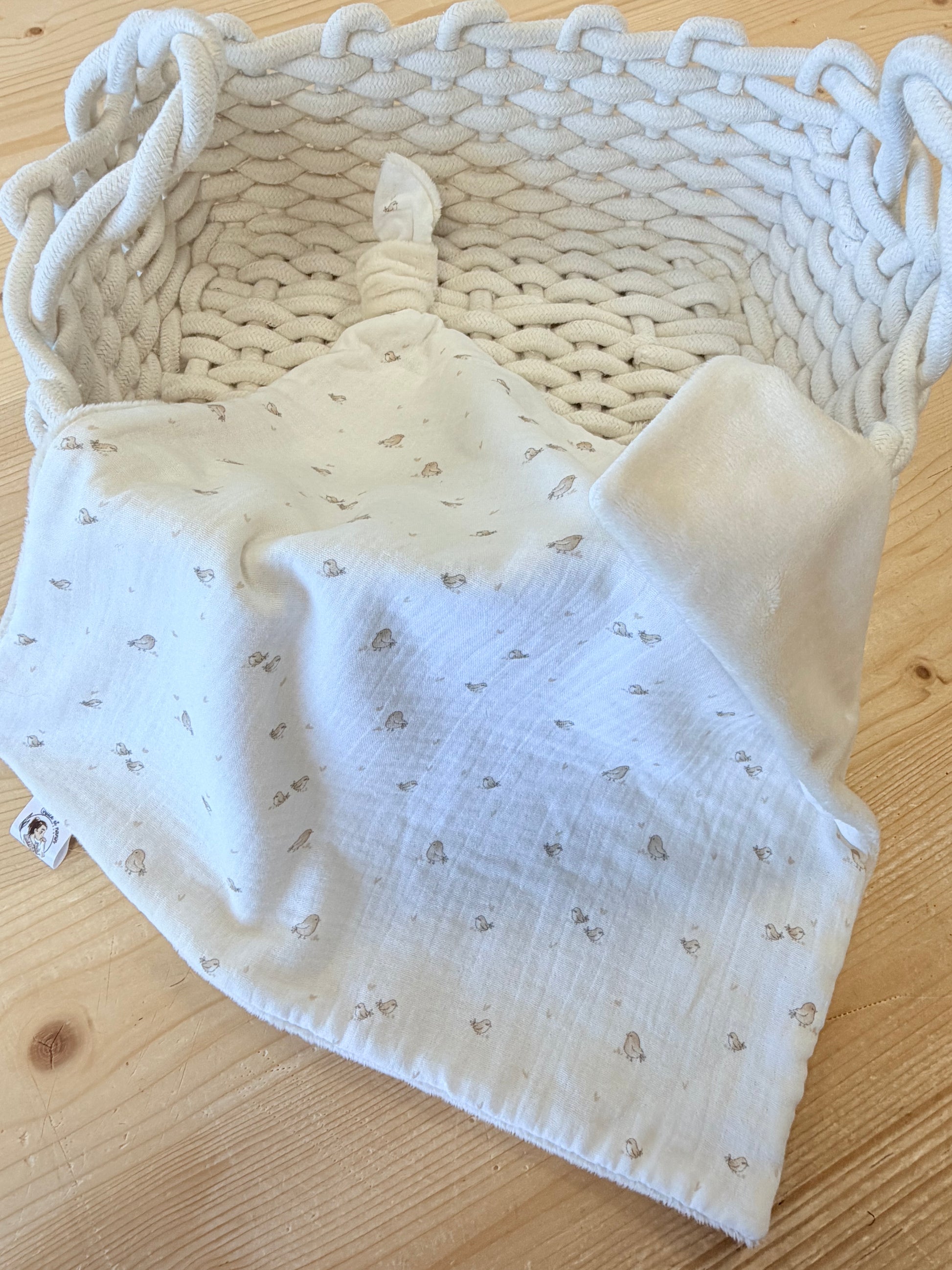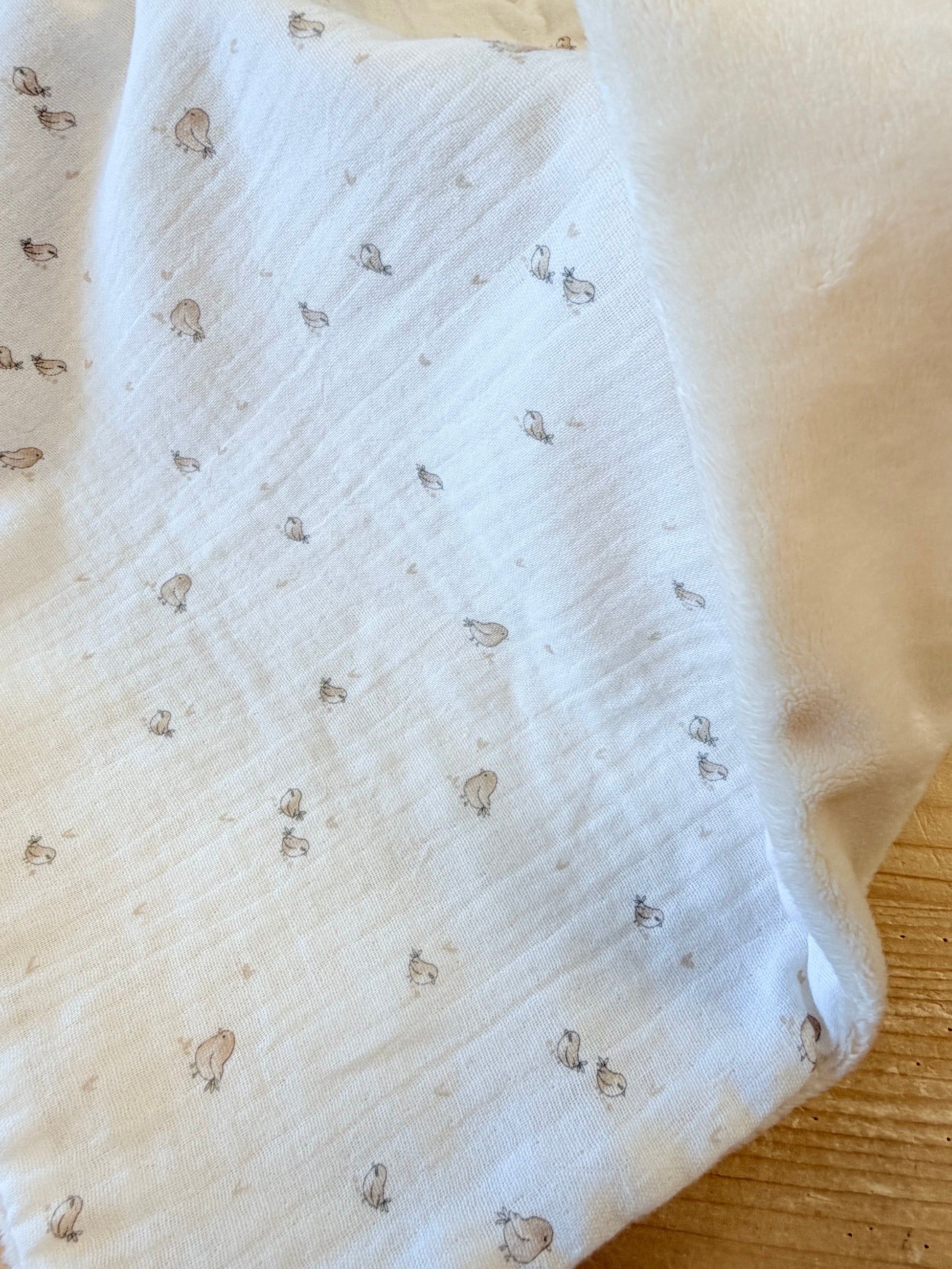 double gaze de coton oiseaux beiges et minky lisse écru