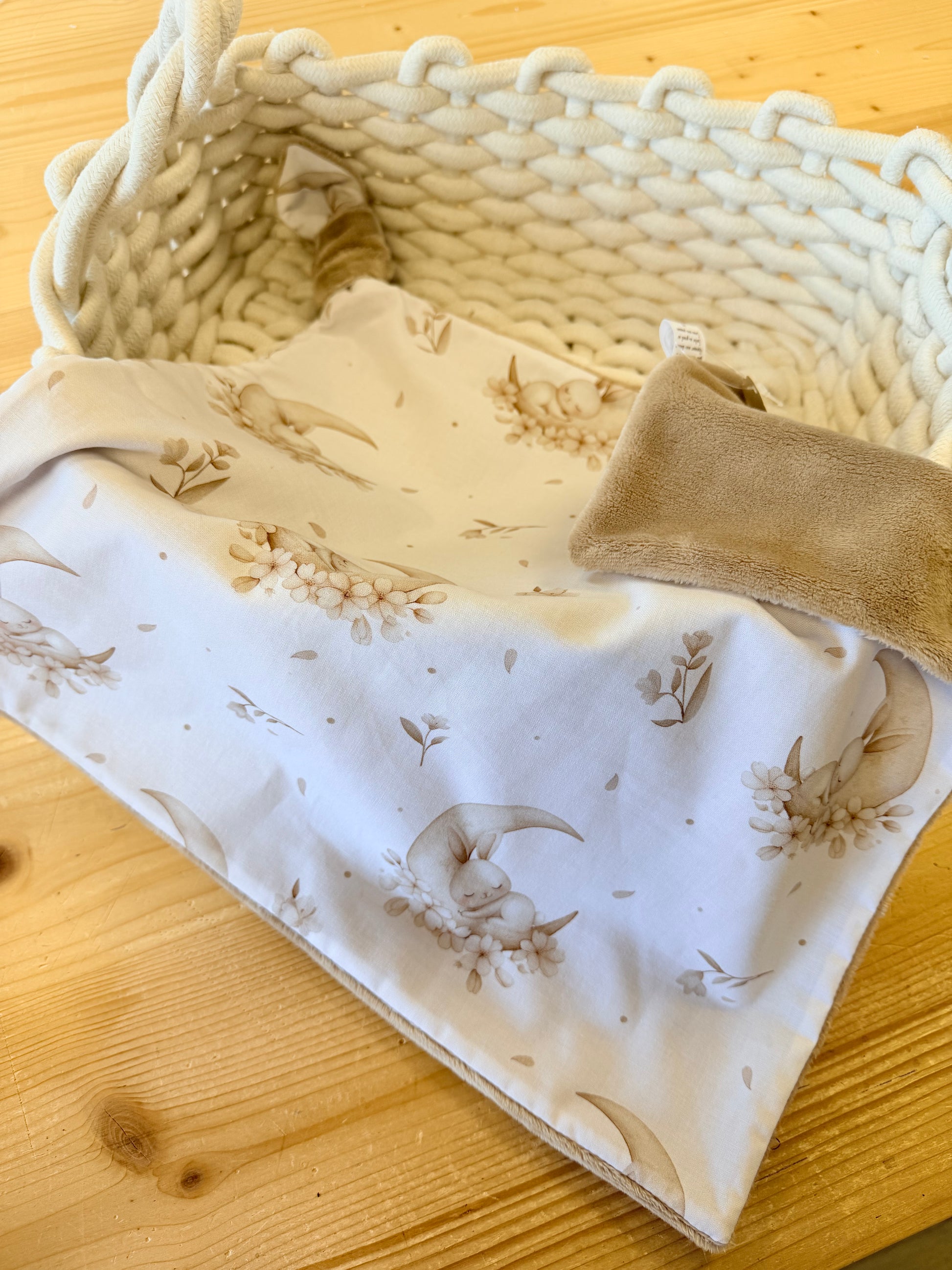 Le Nanin lapin sur la lune est un doudou plat conçu avec un tissu doux, offrant un confort optimal pour les enfants. Son noeud facilite la prise en main par les petites mains, tandis que sa texture apaisante contribue à un sentiment de sécurité, favorisant ainsi un sommeil paisible.