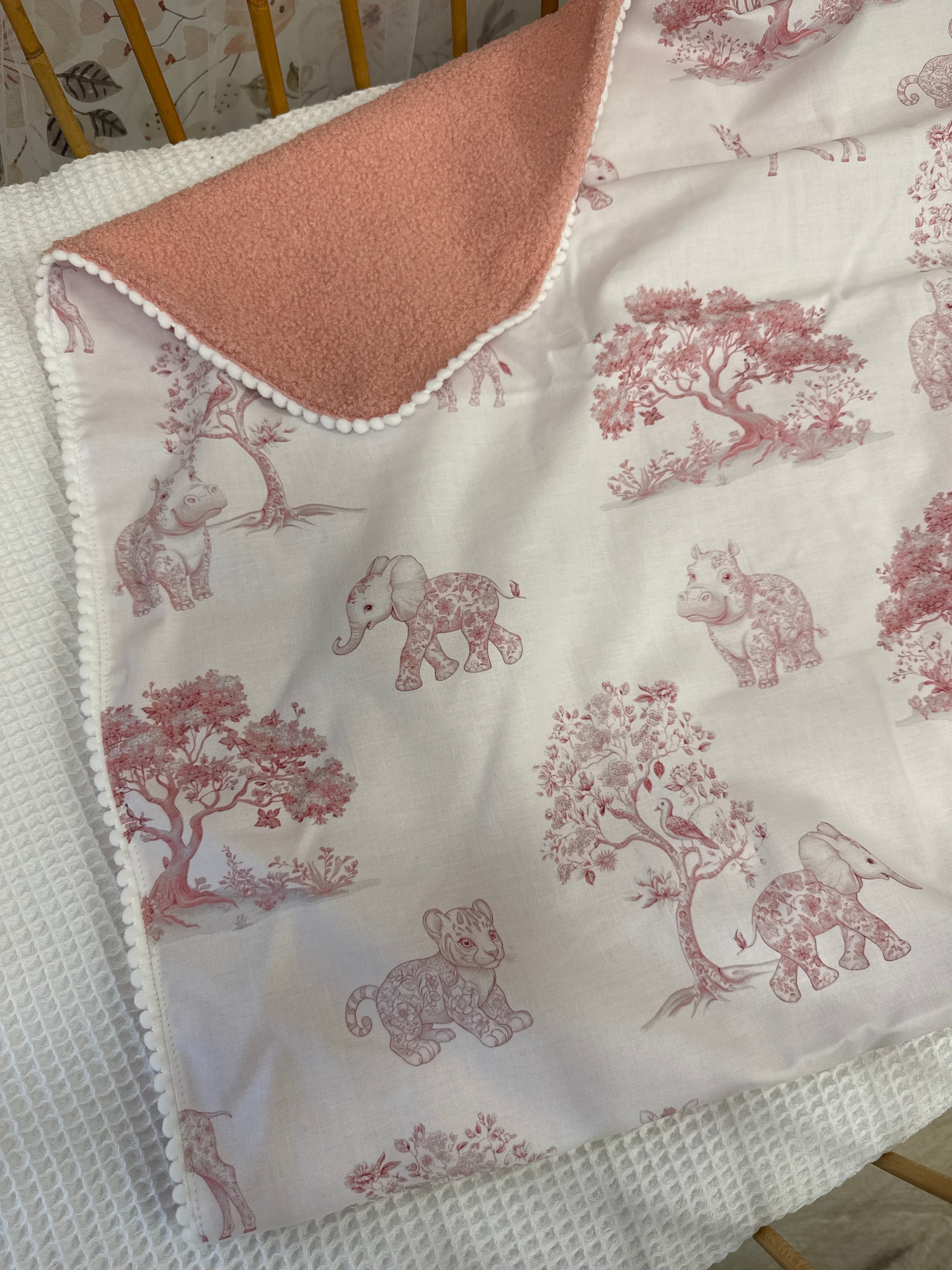 Plaid toile de jouy savane rose teddy vieux rose